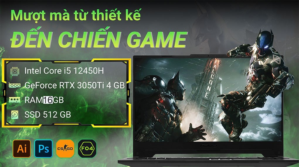 - Asus TUF Gaming mang trong mình hiệu năng vượt trội đến từ bộ vi xử lý Intel Core i5 12450H, đạt số điểm ấn tượng 10817 điểm đa nhân và 1688 điểm đơn nhân khi mình đo hiệu năng bằng công cụ Cinebench R23, sẵn sàng cân mọi tác vụ học tập, văn phòng từ nhẹ đến nặng. Bên cạnh đó, card rời GeForce RTX 3050 Ti 4 GB với điểm số 3DMark mình đo đạc được tổng 5856 điểm GPU cũng cho phép mình làm chủ mọi chiến trường ảo hay xử lý trơn tru các tác vụ thiết kế, đồ họa. Mình đã thử chiến mọi tựa game từ nhẹ đến nặng như thể loại bắn súng CS:GO và game MOBA Liên Minh Huyền Thoại mà máy không hề bị rớt quá nhiều FPS, kể cả trong những cuộc giao tranh có nhiều hoạt ảnh. Mình cũng sử dụng máy để render video phục vụ cho công việc mà không gặp nhiều hiện tượng giật, lag.