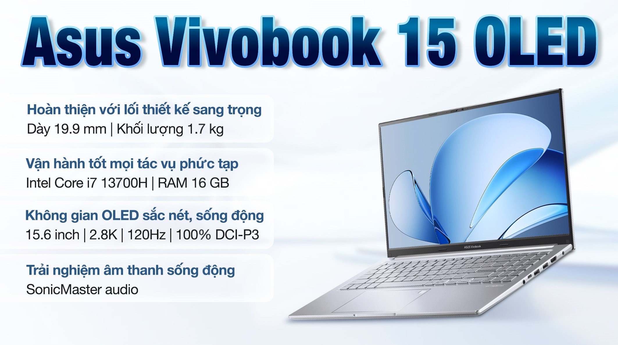 - Laptop Asus Vivobook 15 OLED A1505VA i7 13700H (L1338W) với hiệu suất xử lý ấn tượng từ con chip Intel dòng H hiệu năng cao, kiểu dáng thanh lịch, các công nghệ hiện đại cùng một mức giá ưu đãi. Mẫu laptop đồ họa – kỹ thuật này chắc chắn là sự lựa chọn hoàn hảo để đáp ứng đa nhu cầu từ xử lý thiết kế, làm việc đến giải trí cho người dùng.