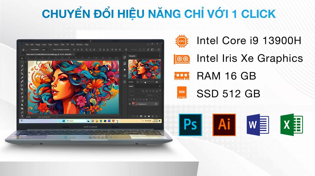 - Laptop Asus Vivobook 15 OLED 2.8K A1505VA i9 13900H (MA586WS) được trang hoàng bởi ngoại hình với đường nét tinh tế, sang trọng, kết hợp cùng những thông số cấu hình vượt trội như CPU Intel Core i9, RAM 16 GB,… sẽ mang lại những trải nghiệm làm việc đa năng và tiện dụng cho các bạn sinh viên, nhân viên văn phòng hay thậm chí là những doanh nhân kỹ tính.