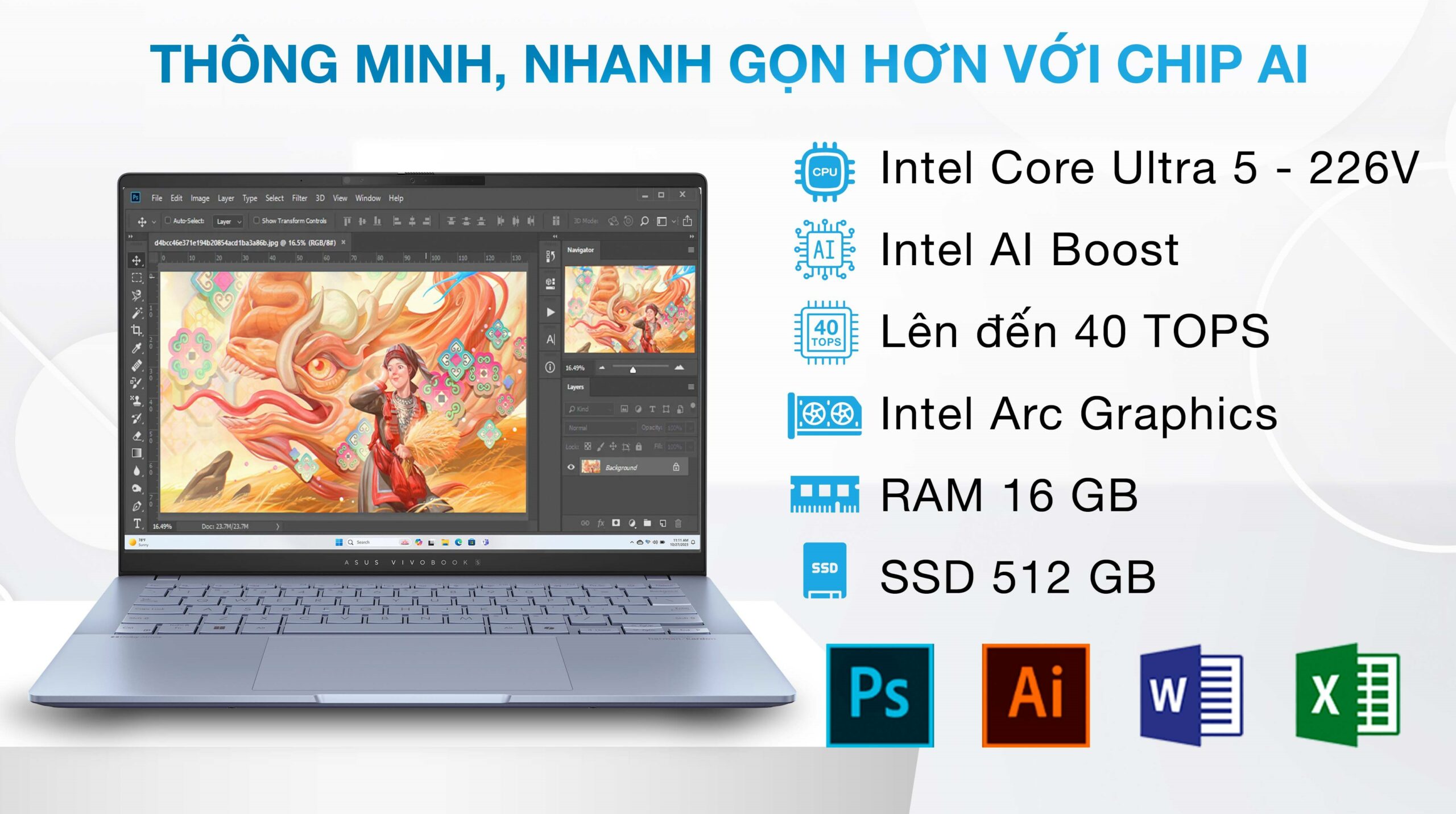 - Asus trang bị công nghệ Memory Allocation Management, cho phép phân bổ tài nguyên thông minh giữa các tác vụ, giúp cải thiện tốc độ xử lý đồ họa, nâng cao hiệu quả làm việc với AI và giảm thiểu độ trễ khi chạy các ứng dụng nặng. Phím AI Copilot chuyên dụng giúp truy cập nhanh các công cụ hỗ trợ AI, đưa trải nghiệm người dùng lên tầm cao mới. Với card đồ họa Intel Arc Graphics, laptop Asus không chỉ mang đến hình ảnh sắc nét, sống động mà còn hỗ trợ tối ưu các ứng dụng chuyên biệt như dựng hình 2D với các nền tảng Adobe, DaVinci Resolve,… hay thậm chí đào tạo mô hình học máy. Những cải tiến này đảm bảo hiệu năng đồ họa tốt, phù hợp với mọi nhu cầu sáng tạo và giải trí.