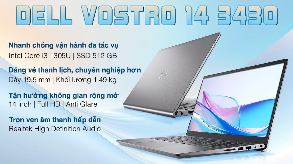 - Bạn cần tìm một chiếc laptop học tập – văn phòng đủ mạnh, màn hình đáp ứng tốt nhu cầu trên, độ bền tốt để học tập và làm việc lâu dài nhưng lại sở hữu một mức giá thành rẻ thì hãy tham khảo ngay laptop Dell Vostro 3430 i3 1305U (71015715) với sự trang bị tốt về hiệu năng và đẹp mắt về ngoại hình đặc biệt phù hợp với sinh viên thuộc đa khối ngành khác nhau.