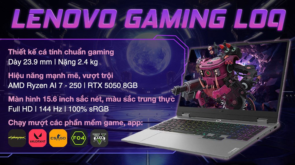 - Trái tim của chiếc laptop Lenovo này là bộ vi xử lý AMD Ryzen AI 7 – 250 với 8 nhân 16 luồng, xung nhịp tối đa lên đến 5.10 GHz nhờ Turbo Boost. Con chip này không chỉ mang lại hiệu năng mạnh mẽ cho các tác vụ gaming, mà còn hỗ trợ xử lý các công việc liên quan đến AI nhờ NPU AMD XDNA với hiệu năng lên đến 16 TOPS. Sức mạnh đồ họa của máy đến từ card rời NVIDIA GeForce RTX 5050 8 GB, cho phép bạn chiến tốt các tựa game AAA ở cài đặt cao và xử lý mượt mà các tác vụ đồ họa nặng như dựng video, thiết kế 3D.