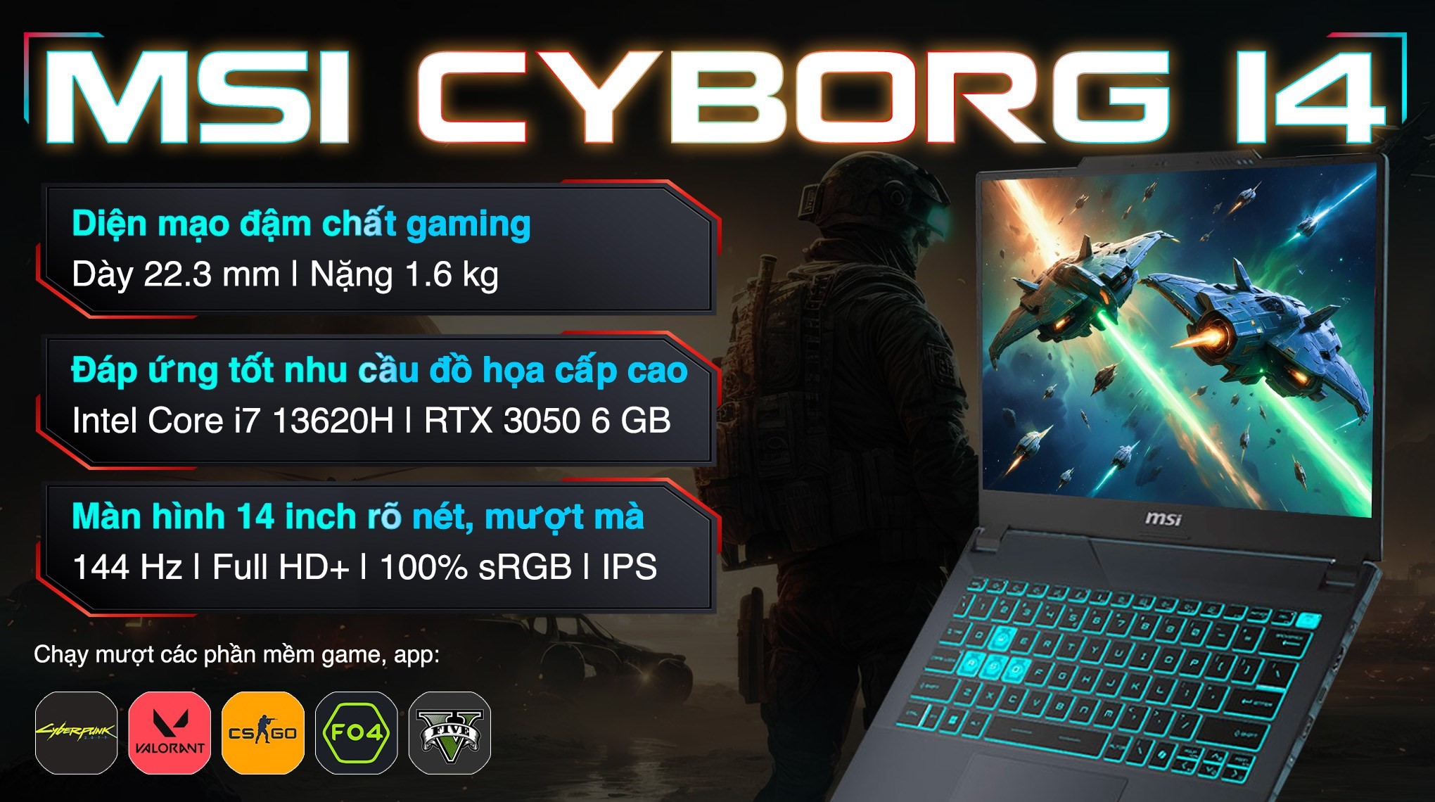 - Laptop MSI Gaming Cyborg 14 A13UDX-099VN i7-13620H không chỉ là sở hữu ngoại hình mạnh mẽ mà còn là một laptop đồ họa đáng tin cậy cho cả game thủ và những chuyên gia thiết kế đồ họa chuyên nghiệp. Với một mức giá hợp lý bạn đã có thể sở hữu ngay một bộ cấu hình hoàn hảo cho những trận game bất tận đầy giải trí.