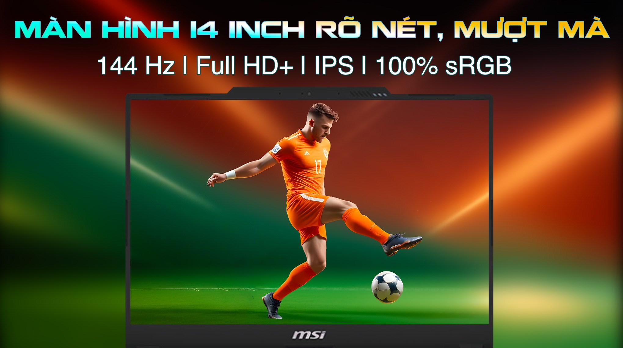 - Màn hình IPS kích thước 14 inch với độ phân giải Full HD+ (1920 x 1200) mang đến hình ảnh sắc nét, sống động từng chi tiết. Góc nhìn rộng và tần số quét 144 Hz loại bỏ hoàn toàn hiện tượng xé hình và nhiễu động, giúp bạn trải nghiệm game và xem phim một cách hoàn hảo.• Nâng cao trải nghiệm chơi game của bạn lên một tầm cao mới với card đồ họa NVIDIA GeForce RTX 3050 6 GB. Hãy trải nghiệm những hành động mãn nhãn và những trận đấu đầy căng thẳng với hình ảnh sắc nét, loại bỏ hoàn toàn hiện tượng giật lag, giúp bạn hoàn toàn đắm chìm vào thế giới ảo của game. Card đồ họa trên MSI Cyborg còn hỗ trợ hoàn thành các tác vụ đồ họa nặng như chỉnh sửa ảnh, thiết kế video chất lượng cao hay render 3D một cách mượt mà và nhanh chóng.