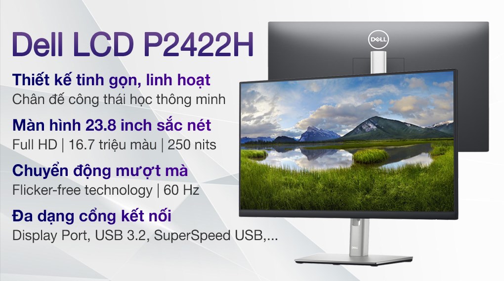 - Màn hình Dell LCD P2422H 23.8 inch Full HD là phiên bản màn hình máy tính với viền mỏng và công nghệ hình ảnh chuyên sâu, phục vụ tốt các tác vụ thiết kế đồ họa hay dựng phim chuyên nghiệp.