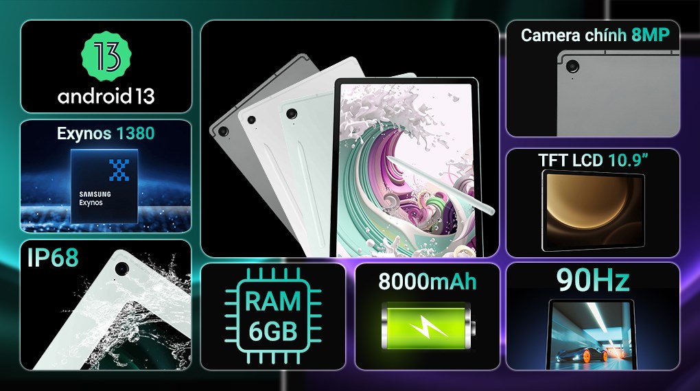 - Samsung Galaxy Tab S9 FE WiFi 128GB được Samsung cho ra mắt vào tháng 10/2023 và mang đến nhiều sự chú ý từ vẻ ngoài cho đến cấu hình bên trong. Những điểm nổi bật mà ta có thể chú ý như trang bị chip Exynos 1380, RAM 6 GB, pin lớn 8000 mAh cũng như có sạc nhanh 45 W. Một trong những điểm đáng chú ý nhất của Samsung Galaxy Tab S9 FE WiFi chính là viên pin có dung lượng lớn 8000 mAh. Điều này biến chiếc tablet này thành một công cụ đáng tin cậy cho cả ngày làm việc hoặc giải trí mà không cần phải lo lắng về việc sạc pin thường xuyên.